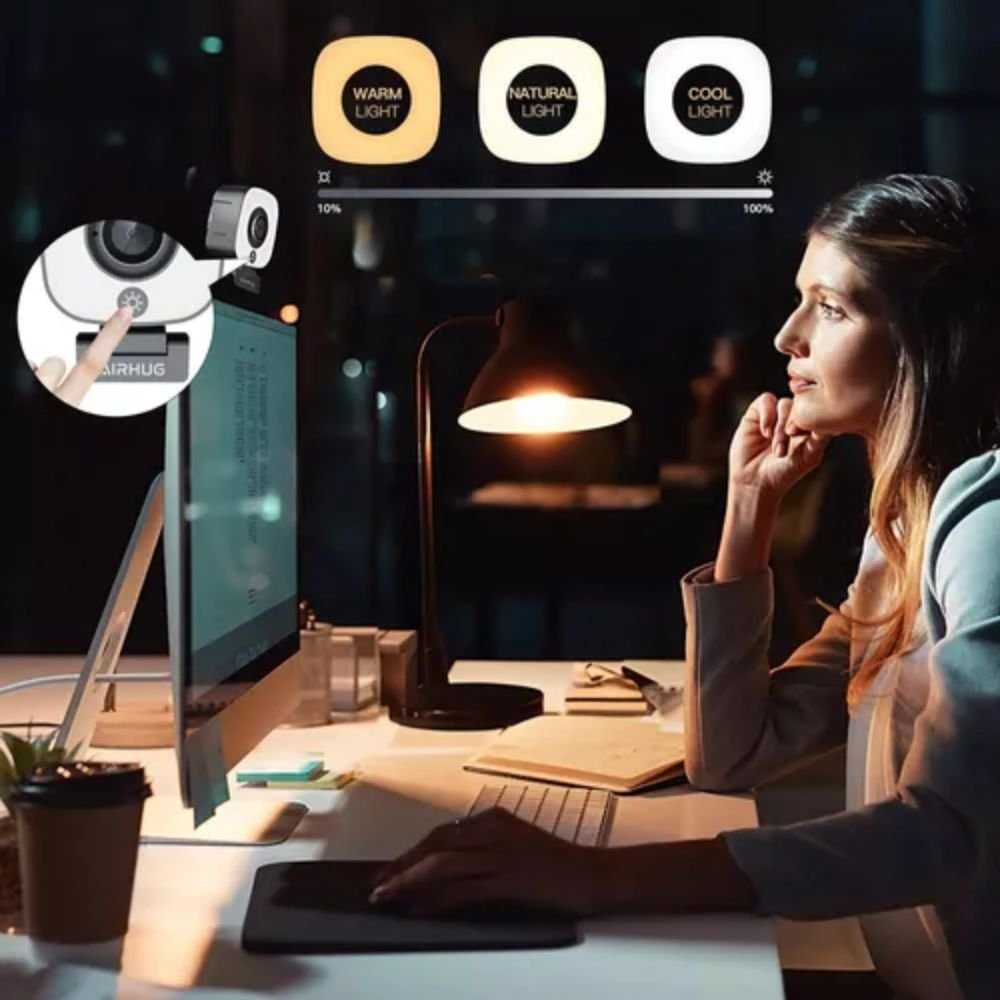 La cámara web AIRHUG 13 es una herramienta completa para quienes buscan calidad profesional en videollamadas, clases virtuales, transmisiones en vivo o reuniones online. Su diseño moderno integra un anillo de luz LED ajustable en tres niveles de temperatura de color: luz natural, fría y cálida. Gracias a su control táctil intuitivo, puedes encenderla, apagarla y ajustar el brillo fácilmente para adaptarte a cualquier entorno.