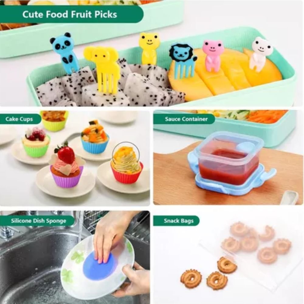 Kit de lonchera Bento Box todo en uno con muchos accesorios, juego de lonchera japonesa 4 en 1 con compartimento para salsa, tenedor de cuchara, tazas para pasteles, palillos de frutas, cortadores de galletas, bolsas de aperitivos, lonchera a prueba de fugas para niños de 8 años en adelante