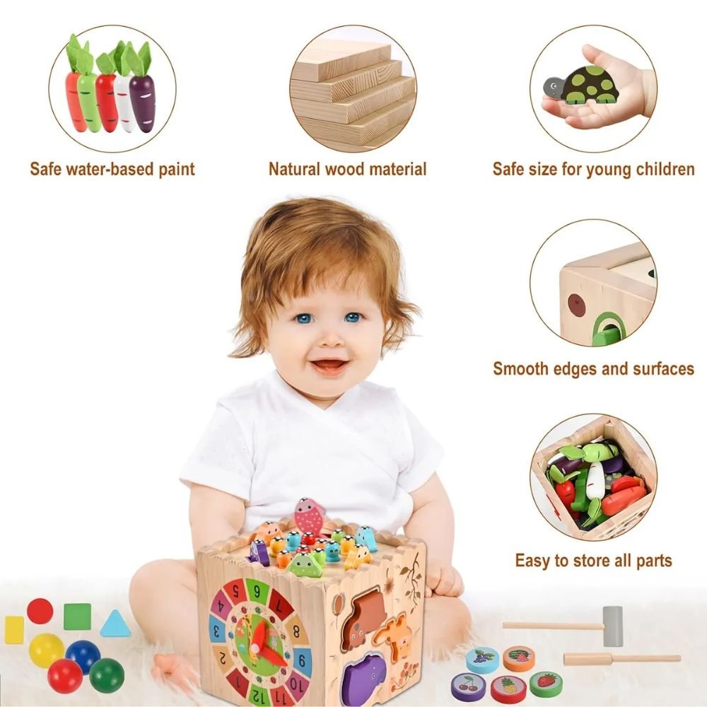 Seguro y duradero: garantizar la seguridad de tu bebé es nuestra primera prioridad. Hecho de madera de caucho natural con bordes redondeados y pintura a base de agua suave, no tóxica, este cubo de actividades garantiza una experiencia de juego sin astillas. Los niños están bien protegidos durante el tiempo de juego.