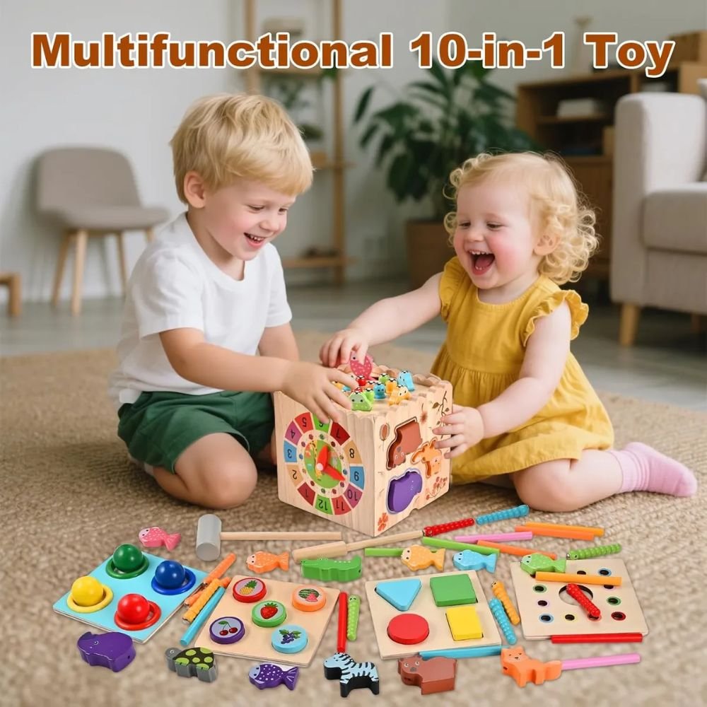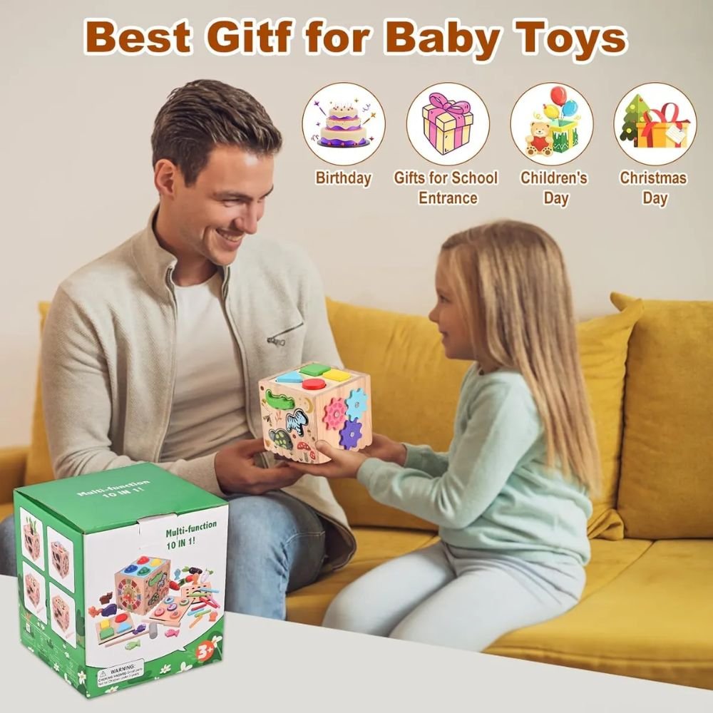 Un juguete todo en uno para niños desde 3 años con 11 actividades que desarrollan habilidades motoras finas y curiosidad: laberinto de cuentas, xilófono, girar engranajes, ordenar por color y más. Seguro, duradero y portátil, hecho de madera natural no tóxica. Perfecto como regalo educativo para cumpleaños o cualquier ocasión 🎁.